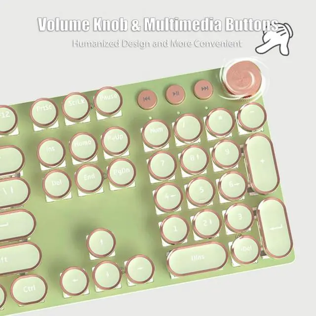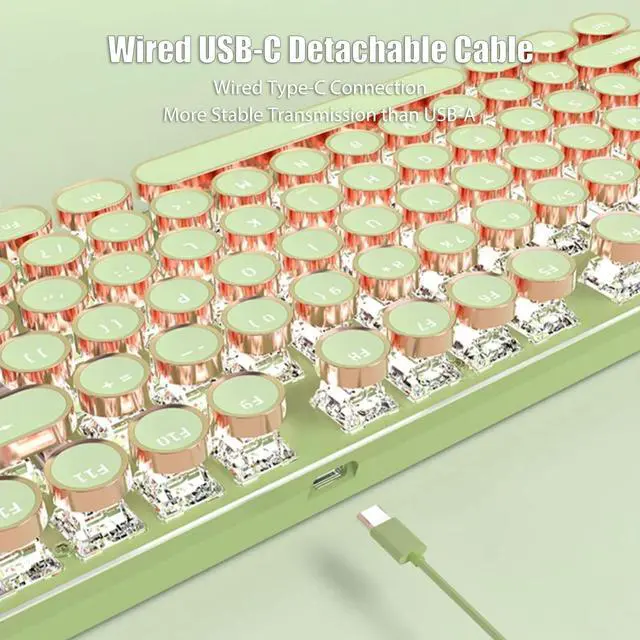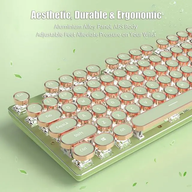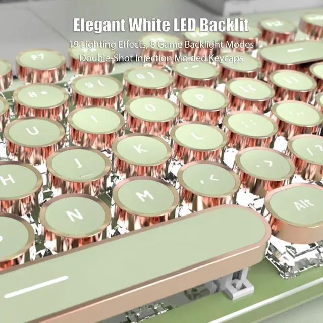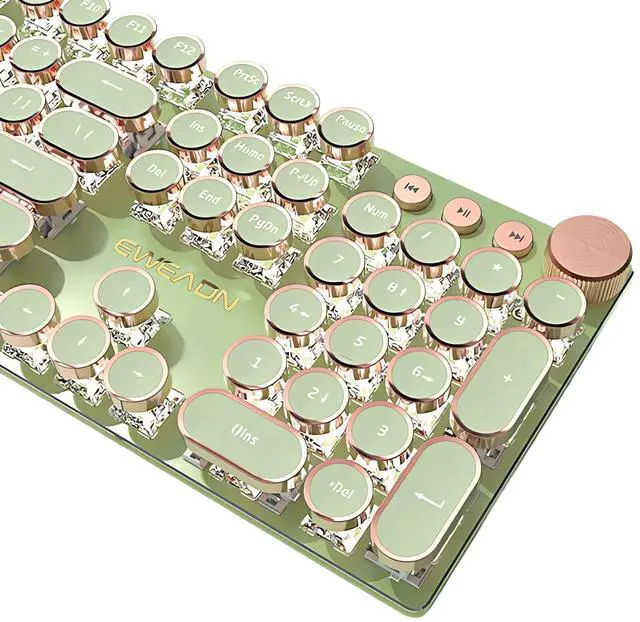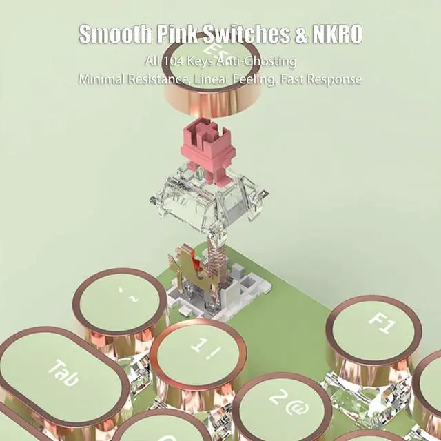 Vintage steampunk round keycaps with golden rings make this keyboard look like a classical typewriter. The custom pink swithes feature a smooth linear feeling and fast action with minimal resistance without a tactile bump feel. The sound is quiet when the button is pressed lightly. Combining an aesthetic retro look with advanced technology, this keyboard will give you a unique typing experience.
