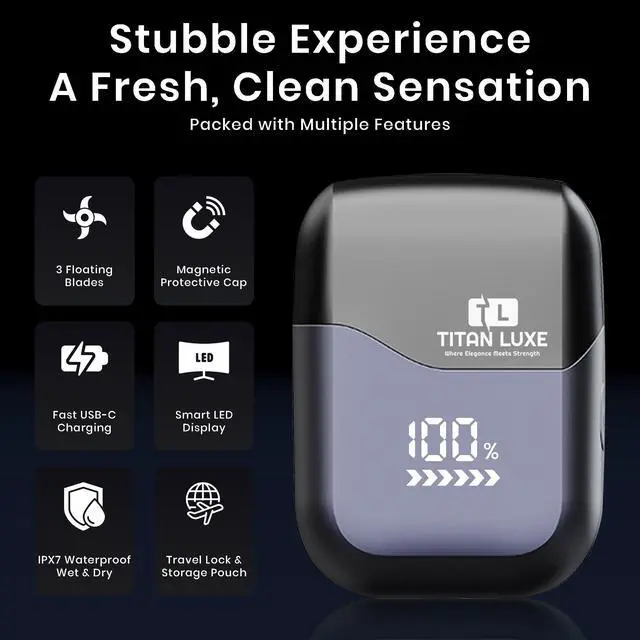 Compact, lightweight, and built for men on the move, the TITAN LUXE mini shaver features a magnetic dustproof cap and travel lock for secure portability. Its the perfect combination of style, power, and conveniencean essential grooming companion for home, gym, or travel.