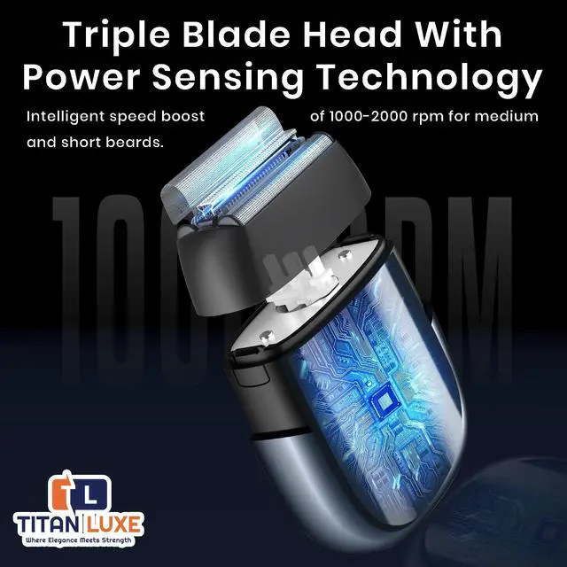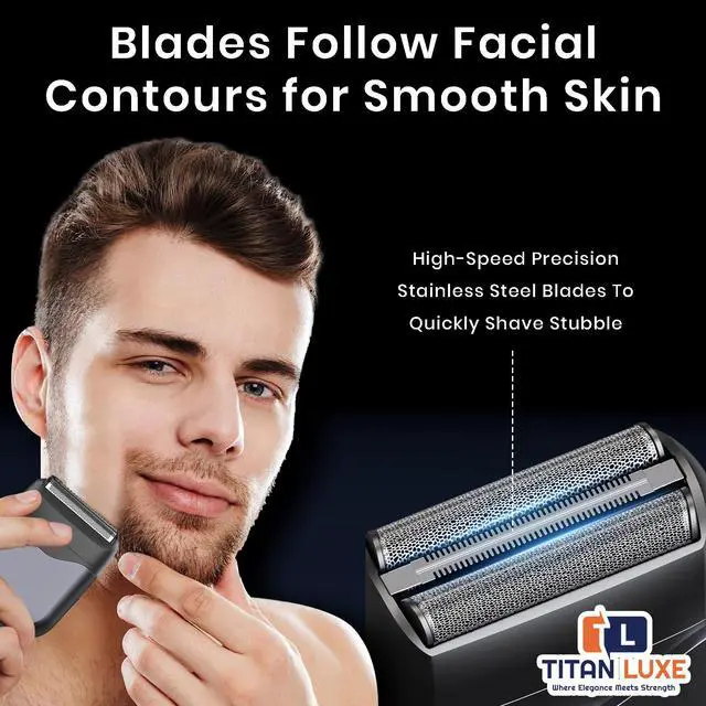 Meet the TITAN LUXE Electric Foil Shaver for Men. The compact, high-performance grooming tool that brings barbershop-level precision to your daily routine. Built with premium materials and smart design, this rechargeable beard trimmer combines stainless-steel precision blades, a 6500 RPM high-speed motor, and a 30° floating head for an exceptionally close, comfortable shave. Engineered for all beard types, the three-layer blade system captures both short stubble and long whiskers in one pass, minimizing irritation and ensuring a consistently smooth finish. The skin-friendly titanium-coated blades and ergonomic body make shaving effortless, even on sensitive skin.