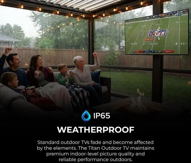 Designed for reliable outdoor entertainment, this outdoor TV is built to perform where standard indoor screens fail. Whether you need a dependable outside TV for a covered patio, porch, or backyard seating area, this model delivers consistent performance as a weather-resistant and weatherproof TV for everyday outdoor viewing. Engineered as a durable outdoor waterproof TV, it provides protection against moisture, humidity, and light rain, making it a practical waterproof TV for outside use in covered environments. This outdoor weatherproof TV is ideal for customers searching for a weatherproof outdoor television that balances durability with modern smart features.