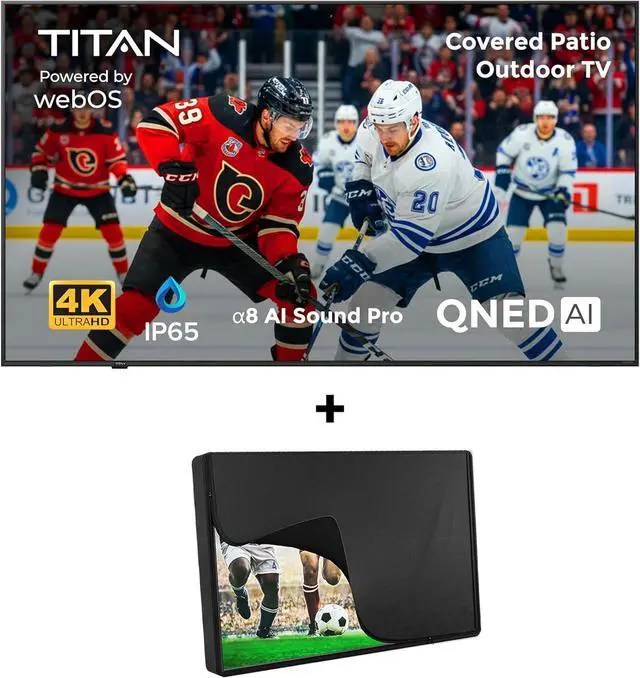 Titan L100 QNED 65 Inch Outdoor TV, Covered Patio, IP65 Smart Weatherproof TV, 4K HDR, 60 Hz, WebAI OS, Wi-Fi 5,Dolby Digital, Outdoor TV Cover, Slim Bezel, 2Yr Wty