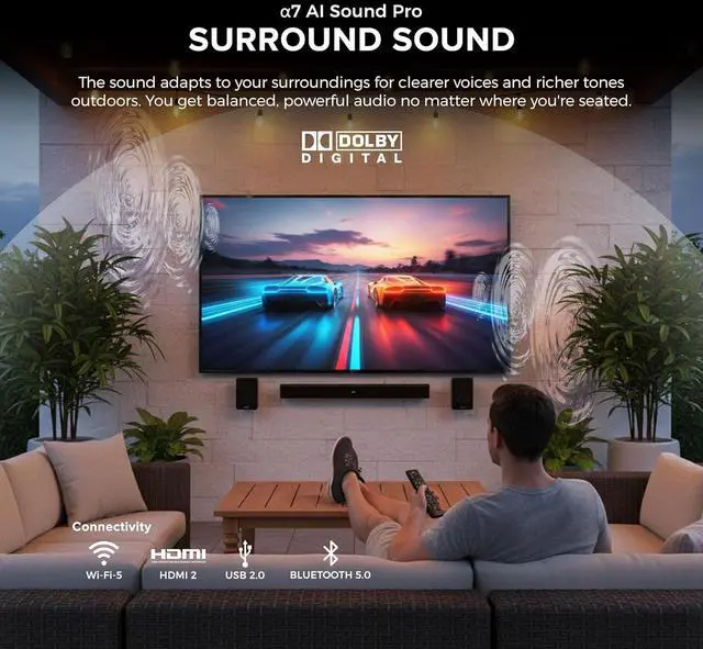 • WEATHERPROOF & WATER-RESISTANT BUILD: Engineered as a weatherproof outdoor TV, this outdoor smart TV withstands rain, humidity, and dust. A reliable waterproof TV for outside, it delivers long-term weatherproof performance in sheltered outdoor areas.