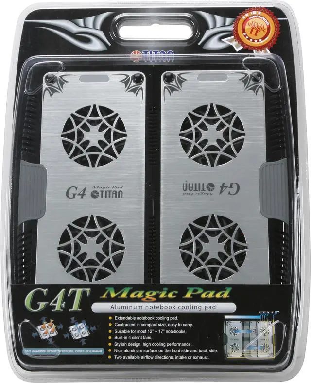 | Features | Extendable notebook cooling pad Contracted in compact size, easy to carry Suitable for most 12" ~ 17" notebooks Built-in 4 silent fans Stylish design, high cooling performance Both the front side and the back side are made of high quality aluminum with a nice hairline finish Two available airflow directions, intake or exhaust |