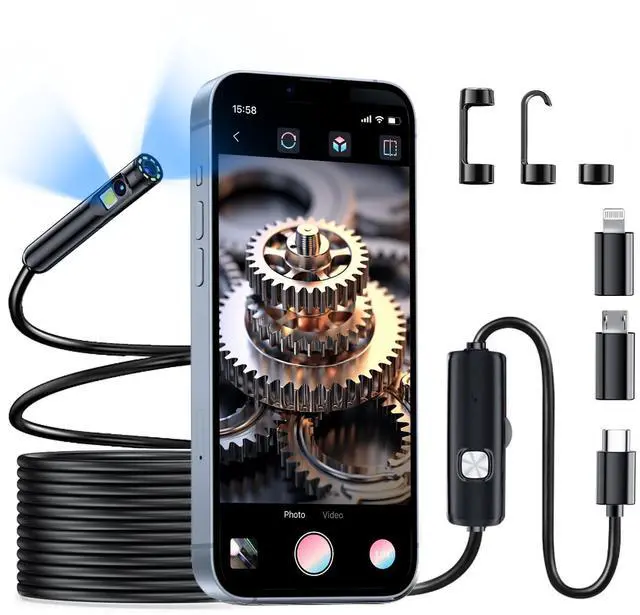 This endoscope is equipped with dual lenses and a 2 Million Pixels inspection camera, long press to switch lenses for better viewing.