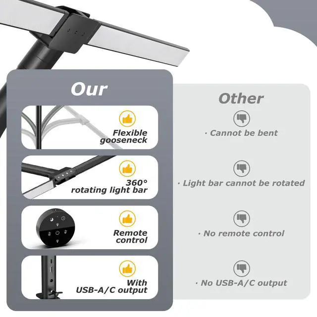 The LED Desk 180° adjustable lamp arms and 360° rotating light bar allow you to customize the angle and height for the perfect lighting setup.
