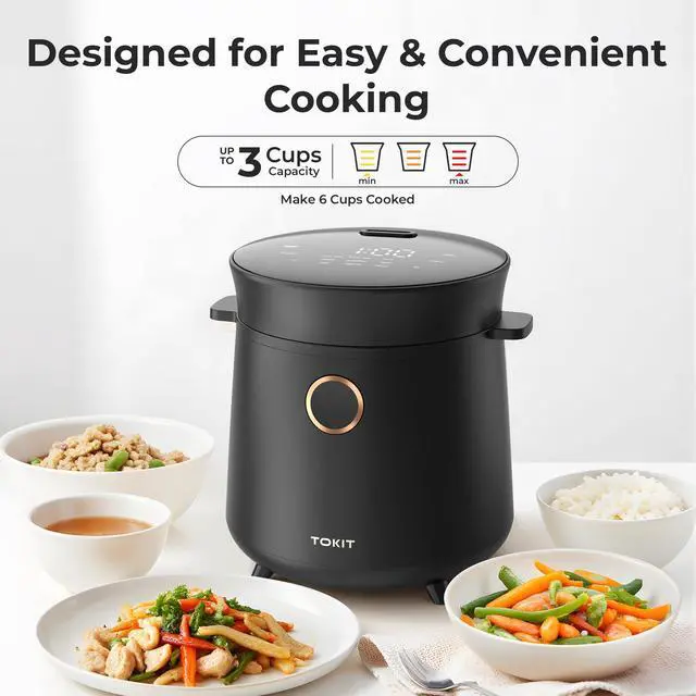 PERFECT FOR SMALL HOMES : TOKIT small rice cooker 3 cups uncooked and 6 cups cooked greatly meets 1-3 people small family.Equipped with a rice shovel and measuring cup,it can meet the rice needs of daily parties or families.With side handles,you can carry it anywhere portable.