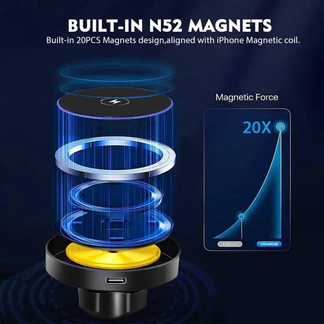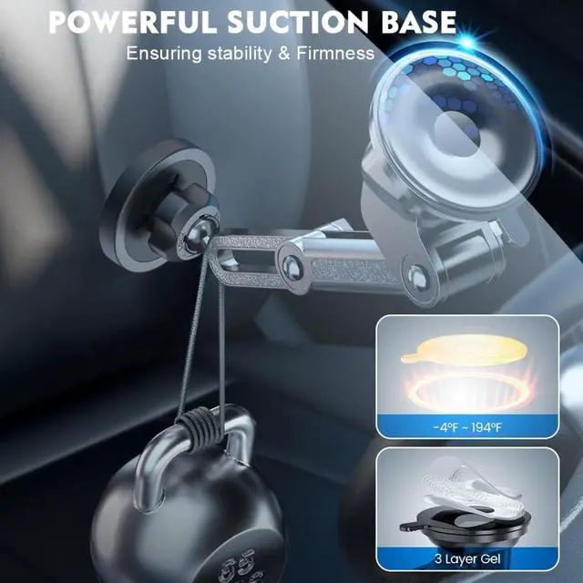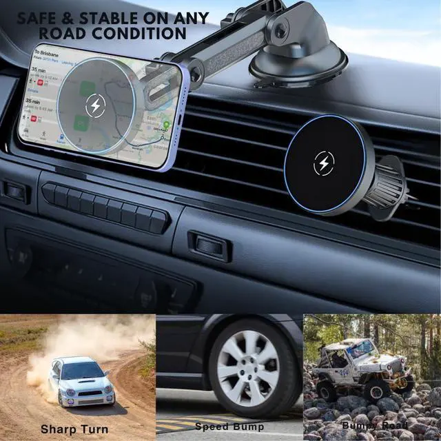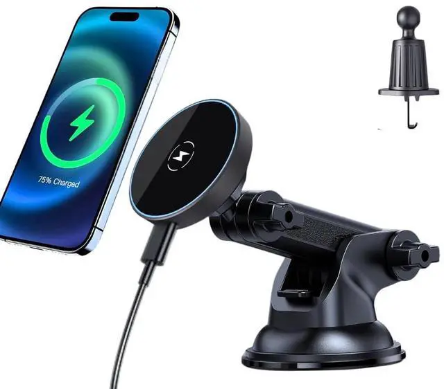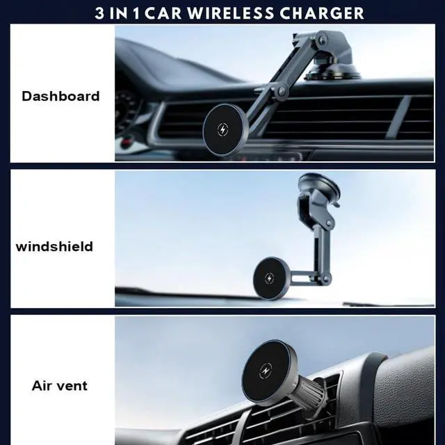 2025 Compatible with iPhone and Android Car Mount Charger for MagSafe 3-in-1 Wireless Fast Charging with Magnetic Suction Cup Mount for Windshield, Vent, or Dash, Type-C Input, 15W Output Power