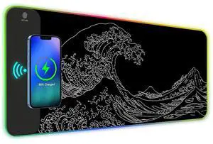 ToLuLu RGB Wireless Charging Gaming Mouse Pad, 7.5/10/15W 10 Light Modes LED Mouse Pad Computer Keyboard Mat Mousepad, 800x300x4MM Extended Large Desk Pad Mat, Japanese Kanagawa Sea Wave Black White