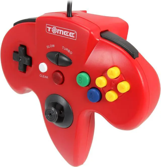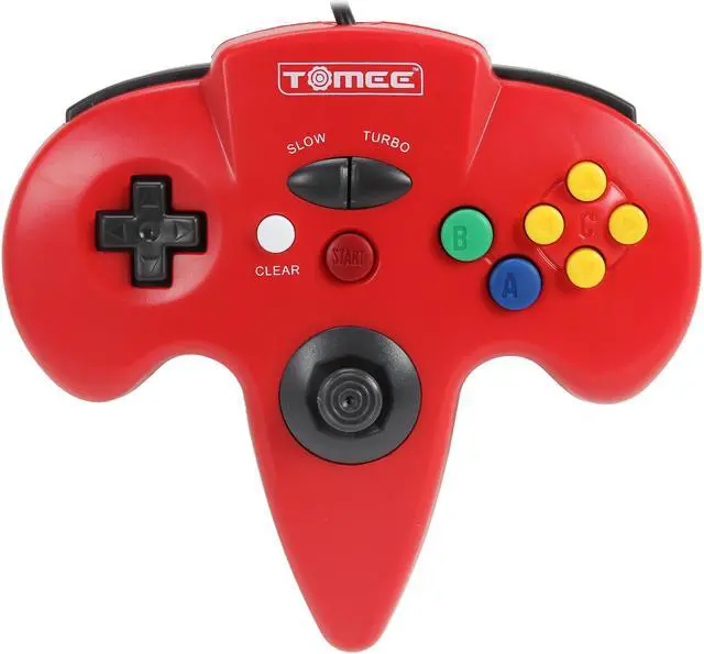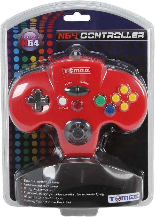 | Feature | The Nintendo 64 Controller features 10 function buttons, slow motion, turbo function, and adjustable auto fire buttons. The controller also has a slot for memory card or rumble pack and analog stick. The Nintendo 64 Controller is compatible with all versions of Nintendo 64. The Nintendo 64 Controller features 10 function buttons, slow motion, turbo function, and adjustable auto fire buttons. Product Features - 10 Function Buttons - Slow Motion - Slot for Memory Card or Rumble Pack - Turbo Function - Auto fire buttons - Precise Analog Stick - Available in red, black, gray, clear, green or transparent blue color |