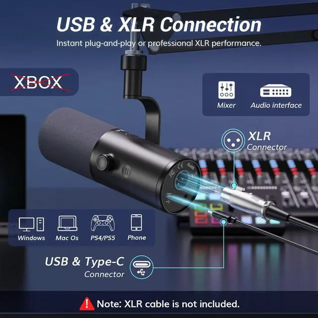 Plug-and-play for gaming via USB; XLR cable sold separately for pro use.