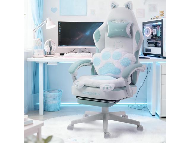 Dowinx Cute Gaming Chair with Cat Ears and Paw Lumbar Seat Cushion, Ergonomic Computer Chair with Footrest, Kawaii Game Chair for girls, Reclining PC Game Chair for Home Use, Blue White
