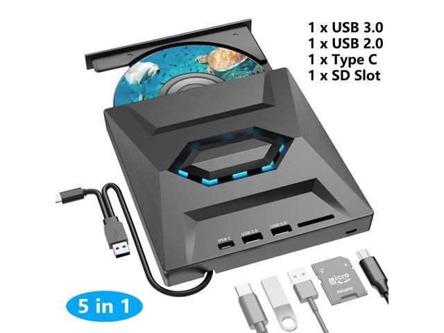 IHDAPP 5-in-1 External CD DVD Drive, USB 3.0 & USB C Portable CD/DVD +/-RW Burner DVD Player for Laptop with 1 USB 3.0, 1 USB 3.0, 1 USB C, 1 SD Card Reader Compatible with Laptop PC Windows Linux Mac