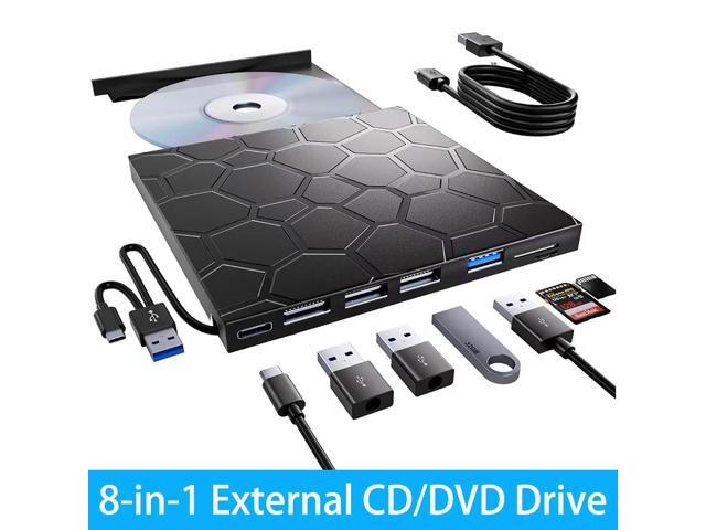 Hitoor 8-in-1 External CD DVD Drive for Laptop, USB 3.0 Type-C Slim Portable Player CD DVD RW Burner Writer Reader with SD/TF Slot & 4 USB Ports, Optical Disk Drive for Windows11/10/Mac OS/Vista/Linux
