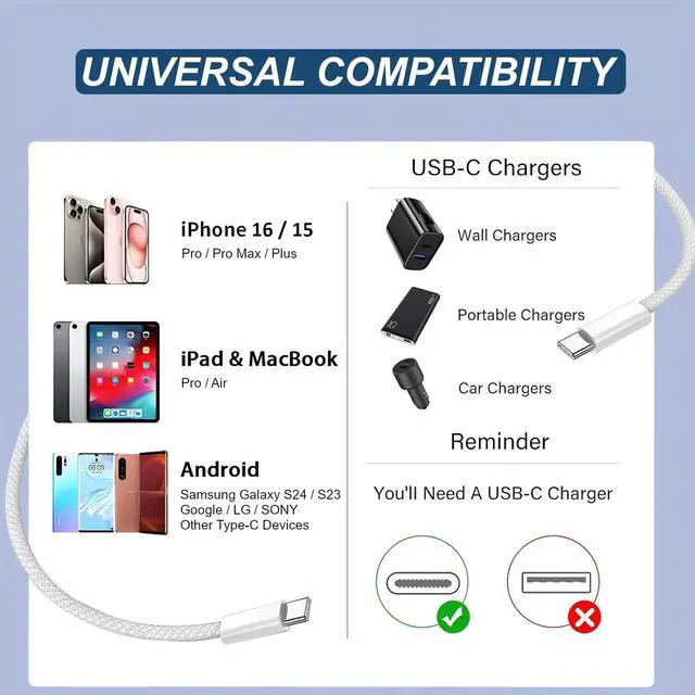 ![Alt view image 7 of 7 - Braided USB C to USB C Cable 3ft - 60W Type C Fast Charger, USBC to USB-C Woven Power Cord for iPhone 17/16/15 Pro Max Plus/MacBook/iPad/AirPods/Samsung Galaxy/Android Devices and More [Pack of 2]](https://c1.neweggimages.com/productimage/nb640/C697D26041804KGCI3F.jpg)