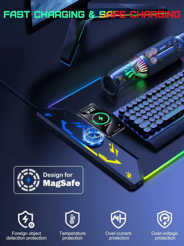 | Additional Features | 15W MagSafe Wireless Charging, Durable, Easy to Clean, 4 RGB Light Modes, 11 RGB Light Colors, Non-slip, Smooth, Waterproof |