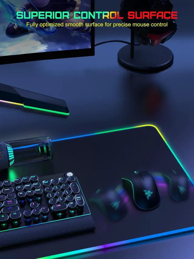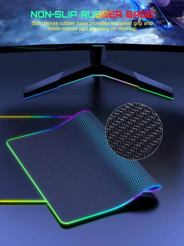 - [One-Touch Control for 4 Light Modes & 11 RGB Colors] This RGB gaming mouse pad has 11 lighting colors and 4 cool lighting modes: Single Color Static, Single Color Breathing, Rainbow, and Faster Rainbow Mode. Long press the RGB light mode option key to control the light on/off(one click also turns on the RGB light); click the option button to toggle between the 11 light colors; and a quick double-click on the option button to toggle between the 4 light modes