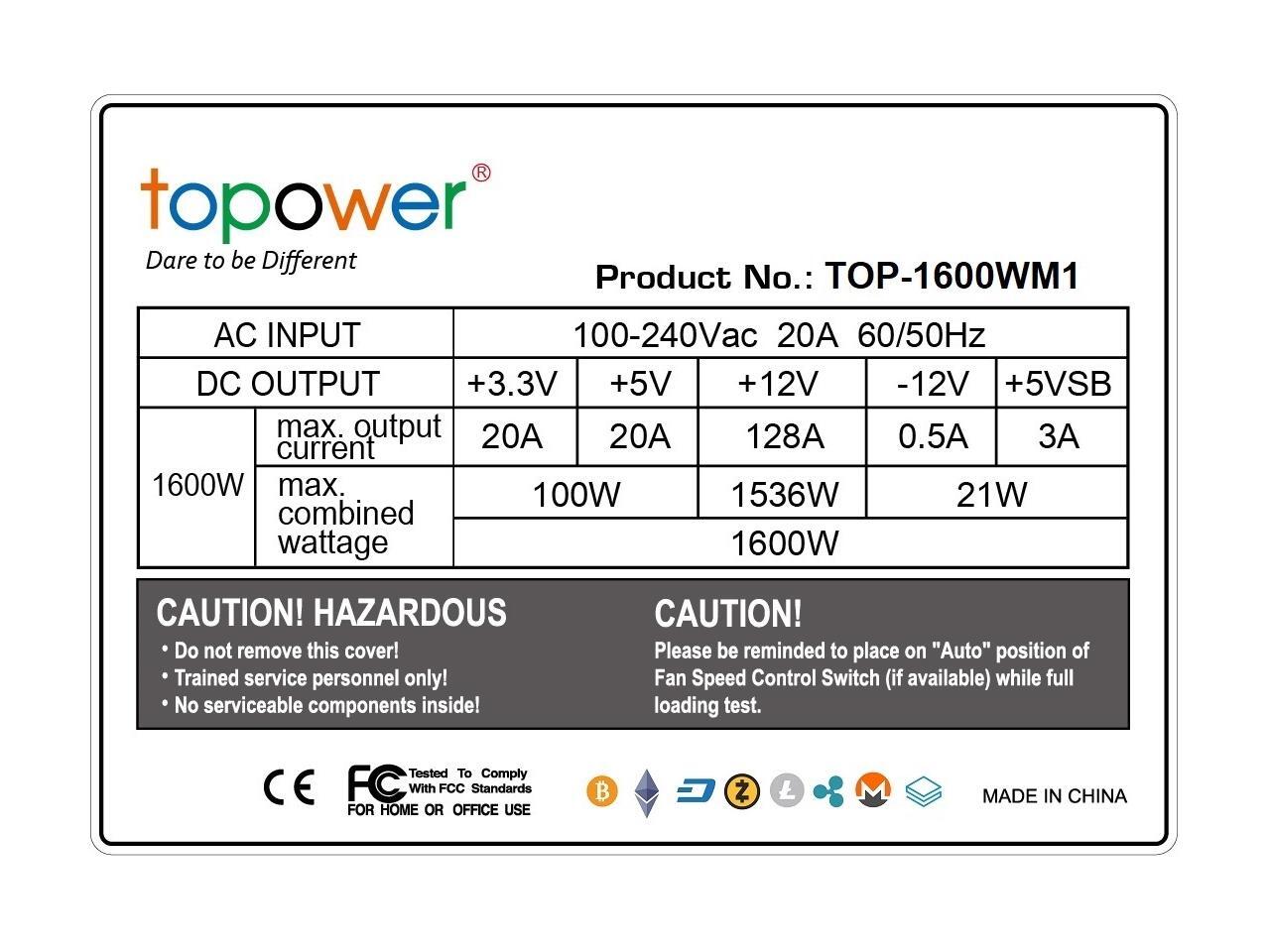 TOPOWER 1600W GPU Mining Power Supply For BTC/BCH/ETC/ETH/LTC/ XMR/XRP/ZEC etc, Ethereum Crypto Coin Mining Miner, Support 8 Graphics Card For ATX Mining Rig, AC Input 100 - 240V