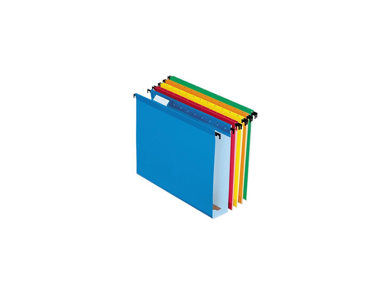 Pendaflex SureHook Reinforced Extra Capacity Hanging Folders have pressboard inserts to expand folders a full 2” to hold up to 400 sheets. Super-strong hanging rods with longer hooks and tension springs keep folders gliding smoothly on the rails. Includes a printable label sheet and 20 clear 1/5-cut tabs. Letter size, assorted colors: blue, red, yellow, bright green, orange. 20 Per box.