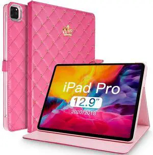 Topwin Cute Crown Case for iPad Pro 12.9-inch (6th,5th, 4th & 3rd Gen),Bling Diamond PU Leather Smart Auto Sleep/Wake Kickstand Shockproof Flip Case for 12.9 Pro Case 2022/2021/2020/2018(Rose Red)