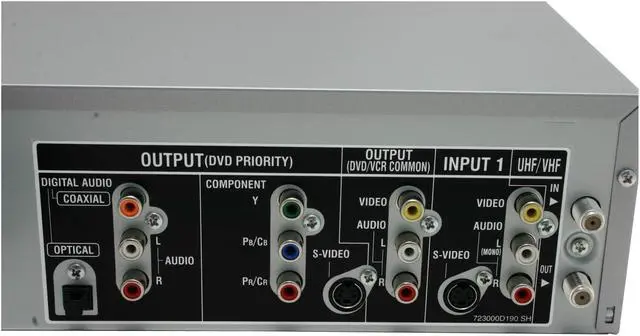 | Connectors | 1 x RF input ( F connector ) - Rear 1 x RF output ( F connector ) - Rear 1 x S-Video input ( 4 pin mini-DIN ) - Front 1 x S-Video output ( 4 pin mini-DIN ) - Rear 1 x Composite video/audio output ( RCA phono x 3 ) - Rear 1 x Composite video/audio input ( RCA phono x 3 ) - Rear 1 x S-Video input ( 4 pin mini-DIN ) - Rear SPDIF output - Rear SPDIF output ( RCA phono ) - Rear 1 x Component video output ( RCA phono x 3 ) - Rear 1 x Audio line-out ( RCA phono x 2 ) - Rear 1 x Audio line-in ( RCA phono x 2 ) |