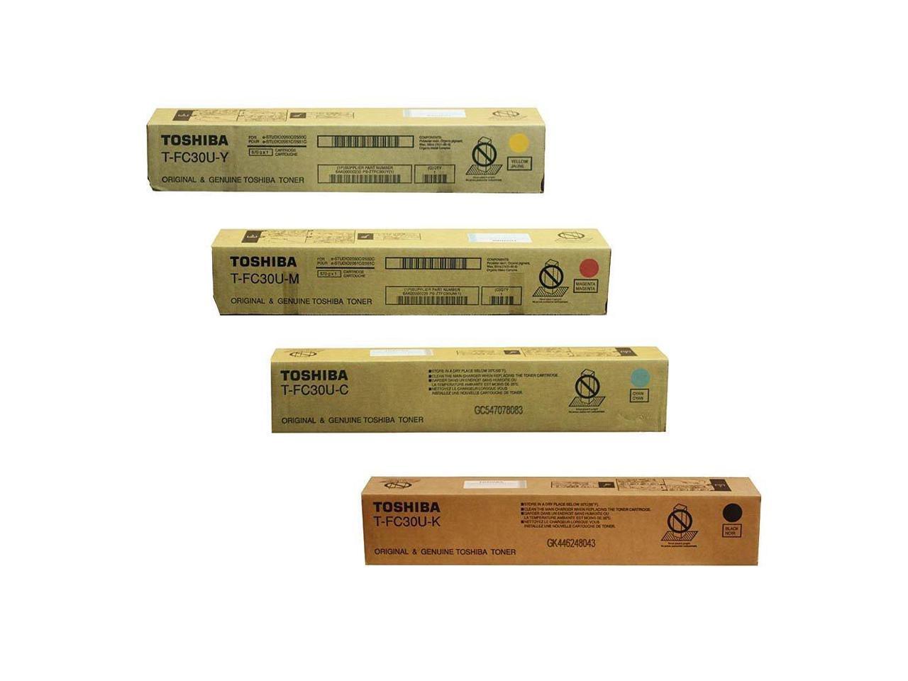 Genuine Toshiba toner value pack for use in Estudio 2050c, Estudio 2051ce, Estudio 2550ce, Estudio 2551c. Contains one of each color. Black TFC30UK, cyan TFC30UC, magenta TFC30UM, yellow TFC30UY. Genuine OEM quality. Reliable and dependable. Easy installa