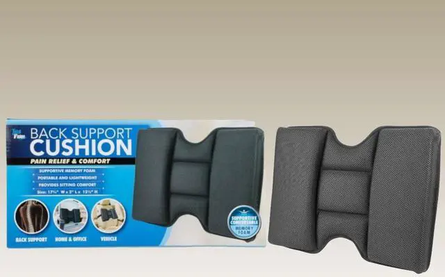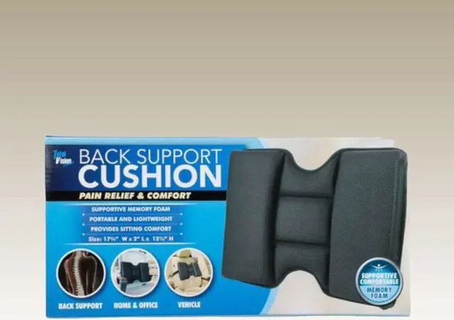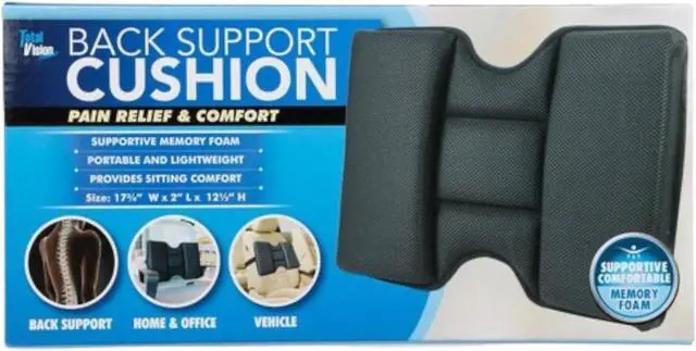 The Total Vision Back Support Memory Foam Cushion is a comfortable and ergonomic cushion made of high-quality memory foam. It provides support and relieves pressure on your back promoting proper spinal alignment and reducing strain. Its contoured shape and removable cover make it suitable for use in various settings such as office chairs and car seats. The cushion aims to enhance comfort alleviate discomfort and contribute to a healthier posture while sitting. ( 17.75"W x 2"L x 12.50" H) Measures 3" x 13" x 16".