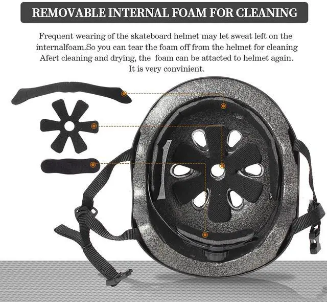 Frequent wearing of the skateboarding helmet may let sweat left on the internalfoam.So you can tear the foam off from the helmet for cleaning Afert cleaing and drying, the foam can be attacted to helmet again.Very Convinient.