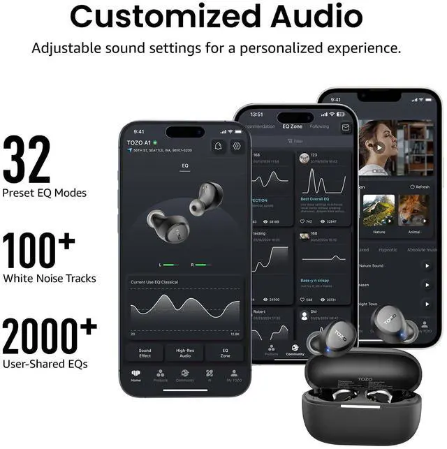 [32 Custom EQ with TOZO App] Use the TOZO app to access 32 EQ presets and adjust bass, vocals, or balanced sound to match your preference.