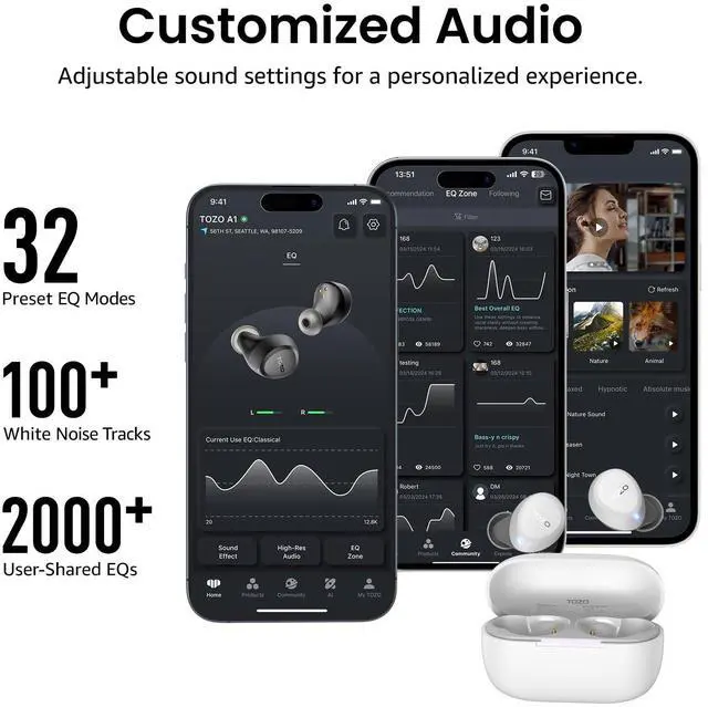 [32 Custom EQ with TOZO App] Use the TOZO app to access 32 EQ presets and adjust bass, vocals, or balanced sound to match your preference.