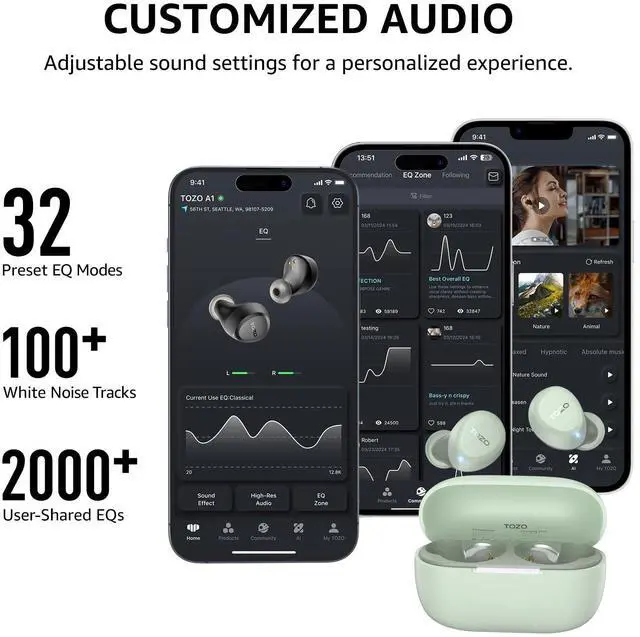 [32 Custom EQ with TOZO App] Use the TOZO app to access 32 EQ presets and adjust bass, vocals, or balanced sound to match your preference.