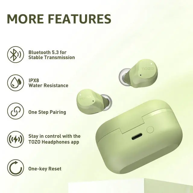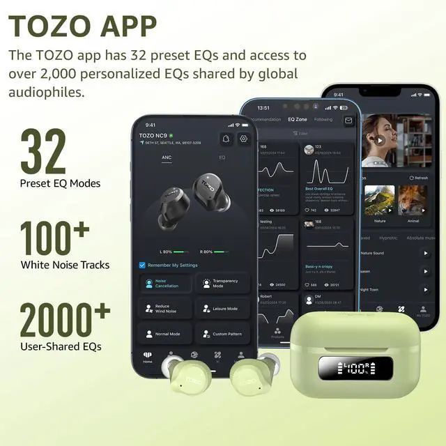 [32EQs Options & Exclusively Sharing Zone] Tailor the sound with the TOZO app further, which allows you to adjust bass levels, music style, and noise cancellation modes to your liking, and experience the joy of sharing your customized EQ with global audiophiles in 'EQ zone'.