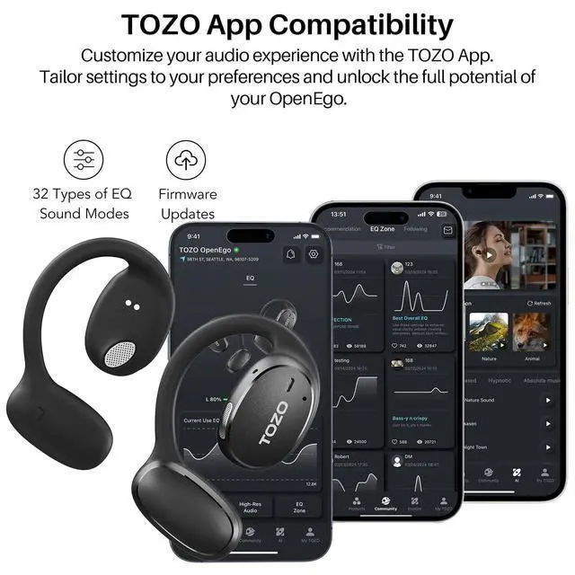 Open Ear Design: The Open Ear Design is engineered for both comfort and safety, offering a breathable and open fit. 16.2mm Oversized Drivers: Big drivers deliver detailed sound with powerful bass. Extended Playtime: The headphones have a total battery life of up to 80 hours. Customized Experience: Customize your audio experience and tailor all the settings to your preferences with the TOZO APP. One-Step Pairing: Effortlessly connect to your devices with one-step pairing. Seamless Touch Control: Effortlessly manage playback, answer calls, and access your voice assistant with just a tap. Smart LED Display: The smart LED display on the charging case keeps you informed about the battery and charging status at a glance.