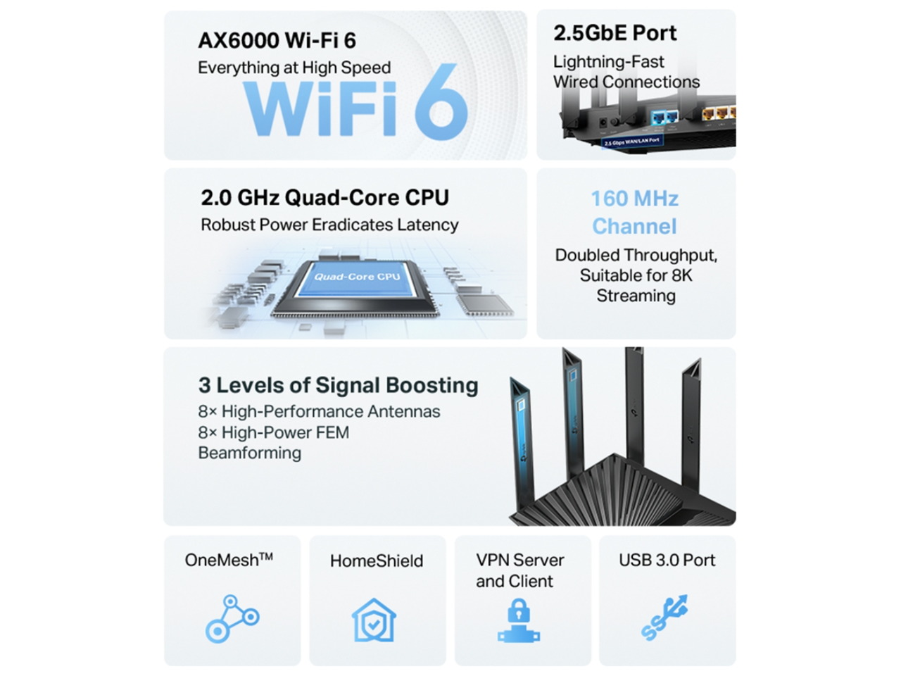 - 2.5G Multi-Gigabit Port: 1× 2.5 Gbps WAN/LAN port + 1× 1 Gbps WAN/LAN port + 3× Gigabit LAN ports + 1× USB 3.0 port ensure max flexibility and boosted throughput.
