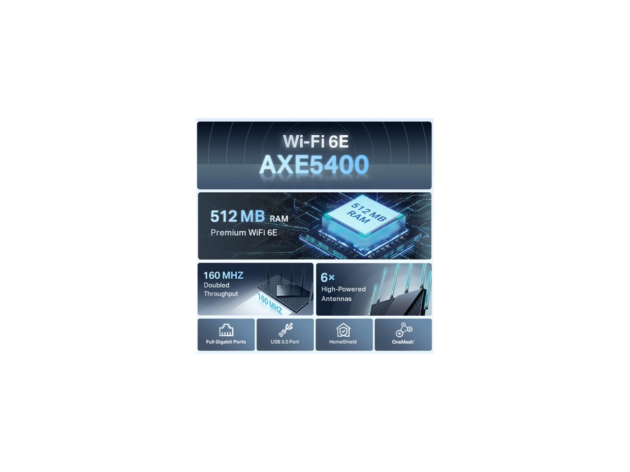 - Tri-Band WiFi 6E Router - Up to 5400 Mbps WiFi for faster browsing, streaming, gaming and downloading, all at the same time(6 GHz: 2402 Mbps;5 GHz: 2402 Mbps;2.4 GHz: 574 Mbps)