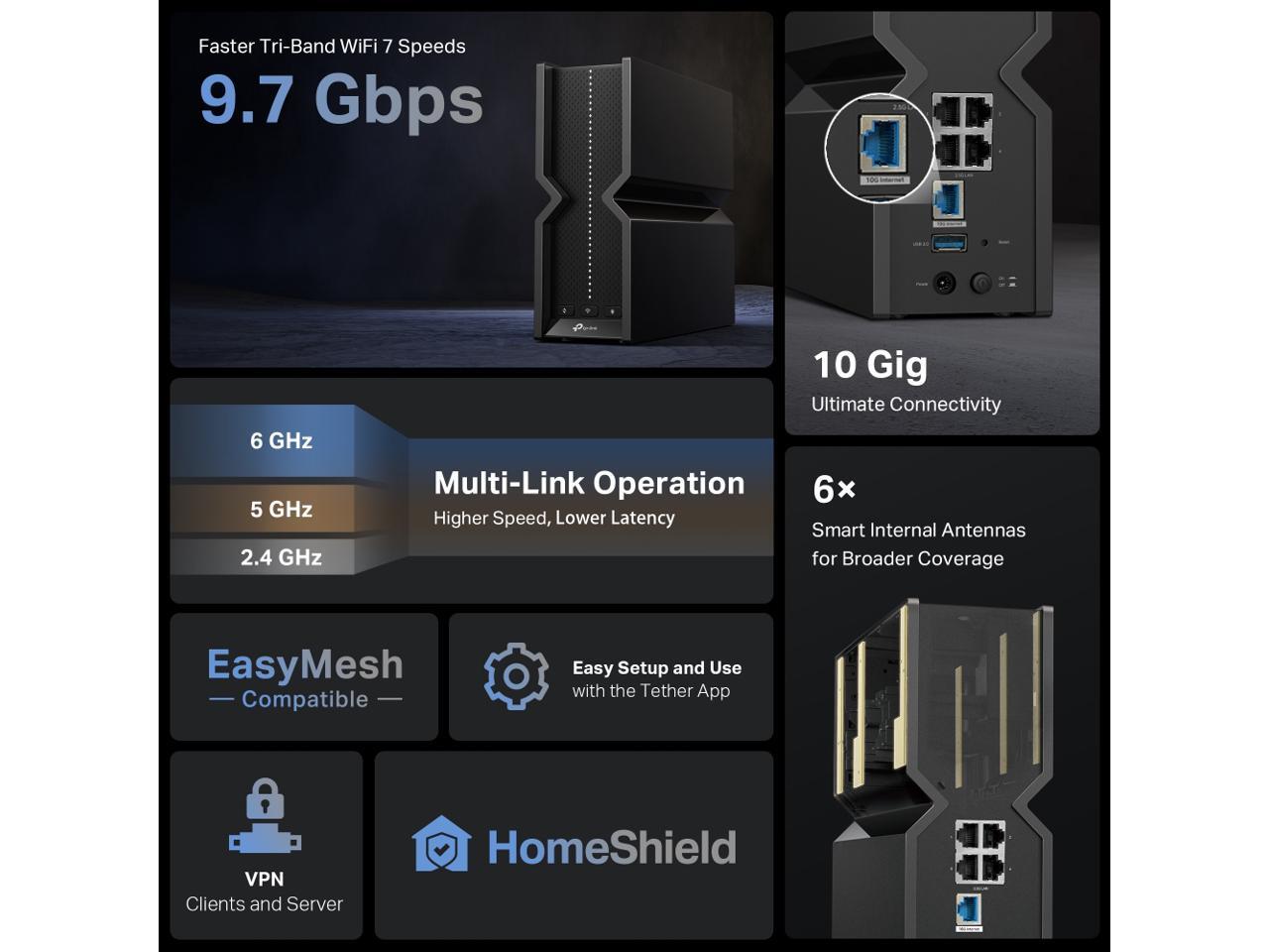 - Blazing-Fast 9.7 Gbps Tri-Band Wi-Fi: Wi-Fi 7 unleashes the full potential of the 6 GHz band with up to 320 MHz channels and 9.7 Gbps Wi-Fi speeds. Enjoy full access to 8K streaming and high-speed downloading.