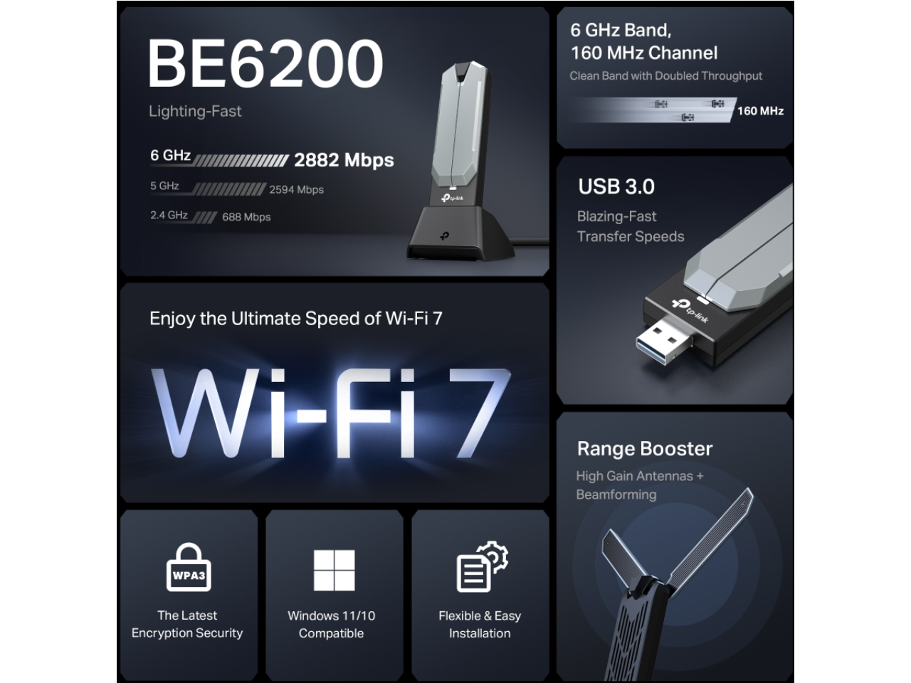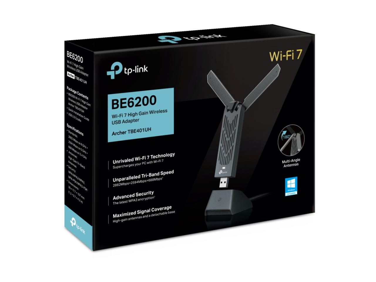 TP-Link BE6200 Tri-Band Wi-Fi 7 Wireless USB 3.0 Adapter Archer TBE401UH | WiFi Adapter for Desktop PC | Supports Windows 11,10 | 2 x High Gain Antennas | 6GHz, 4K-QAM, 160MHz, WPA3 | Secure by Design