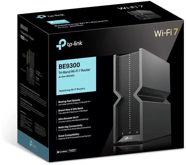 The Archer BE9300 router is a powerful device that takes your Wi-Fi network to the next level with its advanced Wi-Fi 7 technology. With unbelievable speeds of up to 9214 Mbps on a Tri-Band channel, this router outperforms its competitors with sheer performance. The 6 high-performance antennas provide a stable and reliable connection, while the EasyMesh compatibility ensures future expansion of your network coverage. Featuring 1x 2.5 Gbps WAN, 1x 2.5 Gbps LAN, 3x 1 Gbps LAN ports, and USB 3.0, it supports internet plan up to 2.5Gig and offers maximum expandability. With HomeShield, you can rest assured that your home network is protected with enhanced security and detailed network analytics.* Revolutionize your Wi-Fi network, enjoy exceptionally fast speed, and modernize your home with The Archer BE9300 Tri-Band Wi-Fi 7 Router.