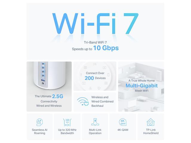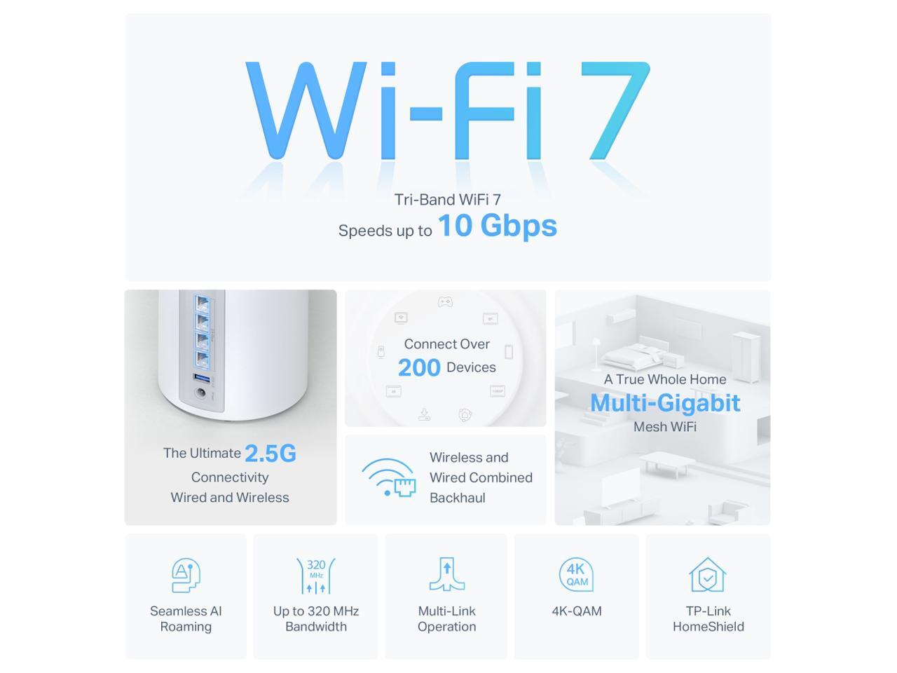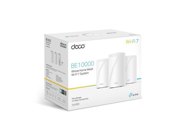 TP-Link Tri-Band WiFi 7 BE10000 Whole Home Mesh System (Deco BE63) | 6-Stream 10 Gbps | 4 × 2.5G Ports Wired Backhaul, 4× Smart Internal Antennas | VPN, AI-Roaming, MU-MIMO, HomeShield (3-Pack)