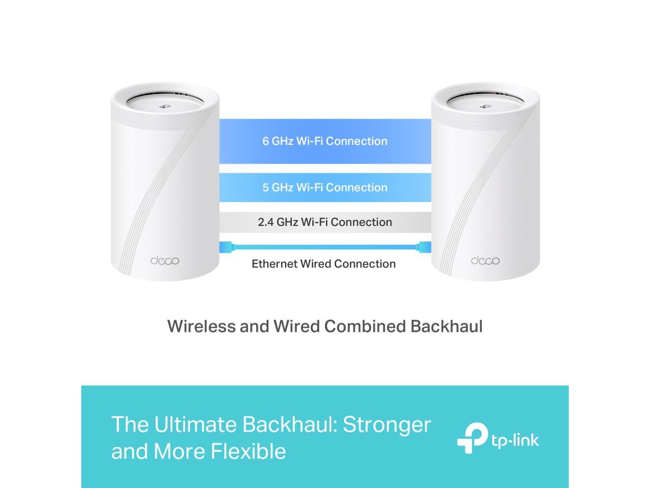 - Through TP-Link's self-developed technology, Deco BE63 can connect to wireless and wired backhaul simultaneously, taking full advantage of the WiFi 7 technology & giving you a faster speeds & wider coverage.