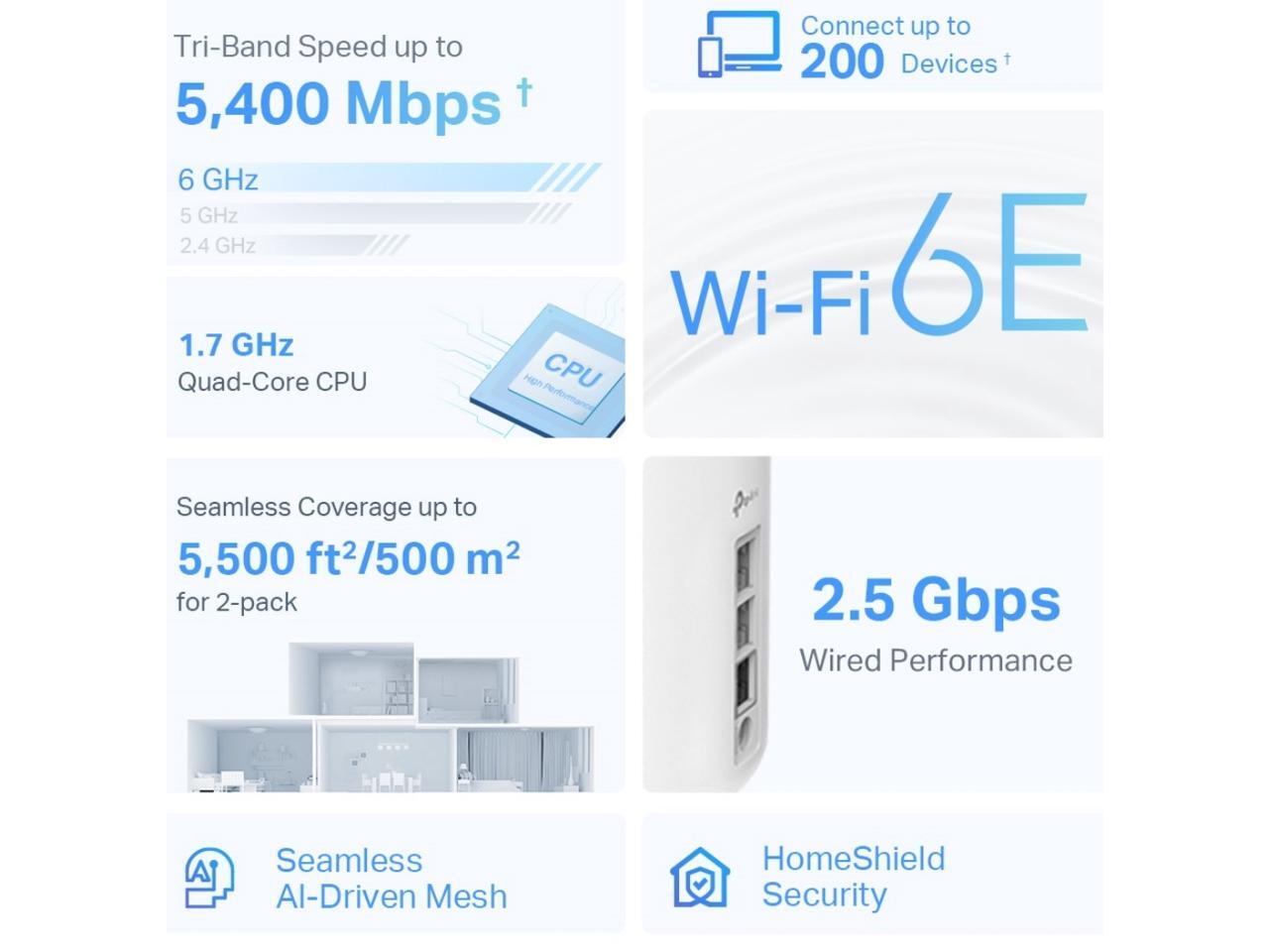 - WiFi 6E Tri-Band Mesh WiFi - Cover up to 5,500 Sq.Ft with next-gen seamless WiFi and make dead zones and buffering a thing of the past