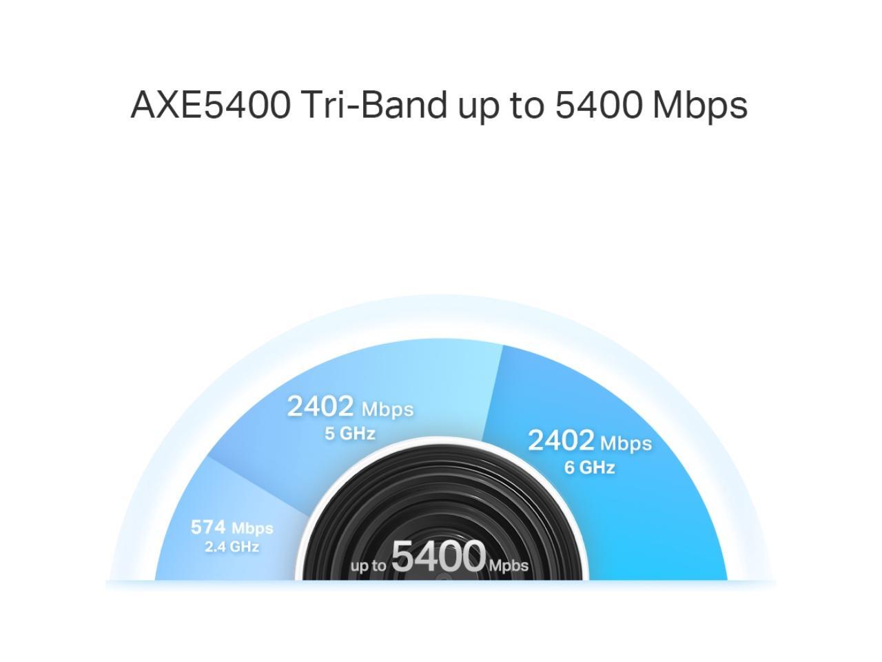 - True Tri-Band Speed - All three WiFi bands work together to unleash your network's total speeds up to 5,400 Mbps for 200 devices (6 GHz: 2402 Mbps (HE160); 5 GHz: 2402 Mbps (HE160); 2.4 GHz: 574 Mbps)