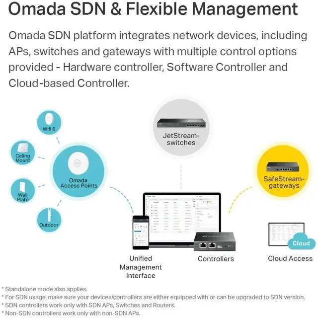 Omada SDN integrates network devices including access points, gateways & switches w/ multiple control options offered - Hardware controller, Software Controller & Cloud-based Controller*.