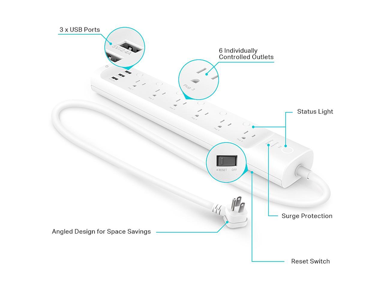 6 smart outlets: Independently control 6 smart outlets, and charge 3 devices with built in USB ports; Ideal for controlling electronics in your home, home office, or small business