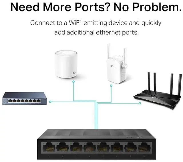 The LS1008G can easily expand your network in a number of ways. Simply connect it to a WiFi device, such as a router or range extender, and transmit reliable internet to up to seven connected devices to experience better performance.