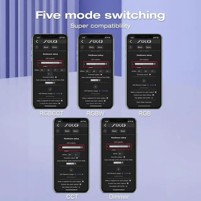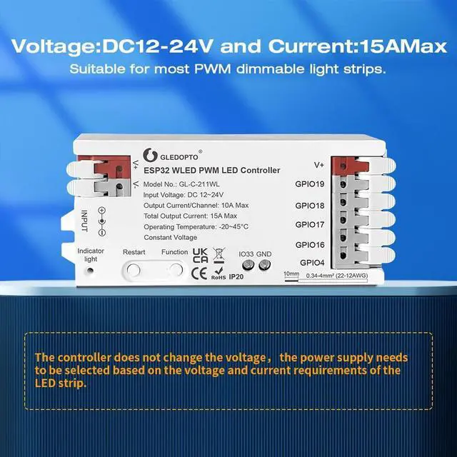 This controller is suitable for most LED strips with PWM dimming methods, such as RGBCCT, RGBW, RGB, WWCW, Dimmer. As long as the voltage is between 12-24V and the current is below 15A, it can be used.