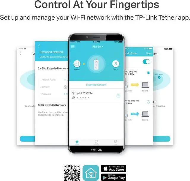 High Speed Mode: Maximized Speed with Dedicated Backhaul Uses one dedicated Wi-Fi band as backhaul and another dedicated Wi-Fi band as an access point to maximize the bandwidth on the extended Wi-Fi. Built-In Access Point Mode RE550 is more than a wireless range extender. Simply plug an Ethernet cable into its Ethernet port and easily turn your wired internet connection into a 3x3 MIMO dual band wireless access point. Control at Your Fingertips Set up and manage your Wi-Fi through the TP-Link Tether app from your smartphone (Android, iOS), including TP-Link routers and range extenders.