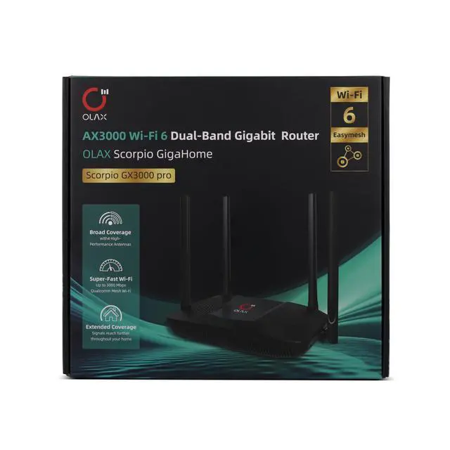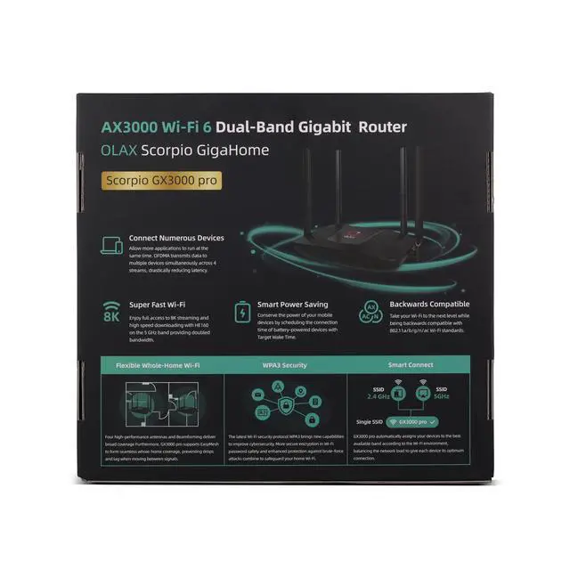 In addition to performance, the OLAX Scorpio prioritizes energy efficiency with smart power-saving features that schedule connection times for battery-powered devices, extending their life. It's backwards compatible, supporting older 802.11a/b/g/n/ac Wi-Fi standards, and incorporates the latest WPA3 security protocol for enhanced cybersecurity. The router's flexibility is further enhanced by EasyMesh support, which allows for seamless whole-home coverage, eliminating dead zones and ensuring a stable connection as you move around the house. This makes the OLAX Scorpio GigaHome AX3000 an ideal choice for a modern, connected home.