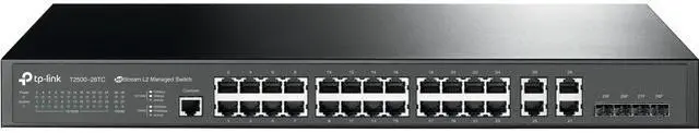 TP-LINK JetStream L2 managed switch T2500-28TC provides non-blocking switching solution for a 10/100Mbps fast Ethernet connection. As to the switching capacity, T2500-28TC has a non-blocking aggregated bandwidth of 12.8Gbps. It provides 24 10/100Mbps ports and 4 gigabit 10/100/1000BASE-T ports. All of these ports are combo gigabit ports, which will be disabled if the corresponding 1000BASE-X SFP slots are used. It can give you greater network flexibility.