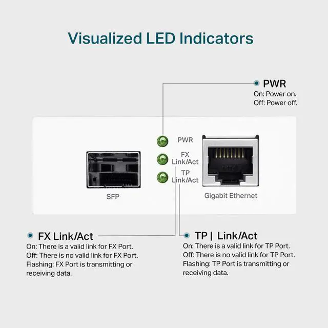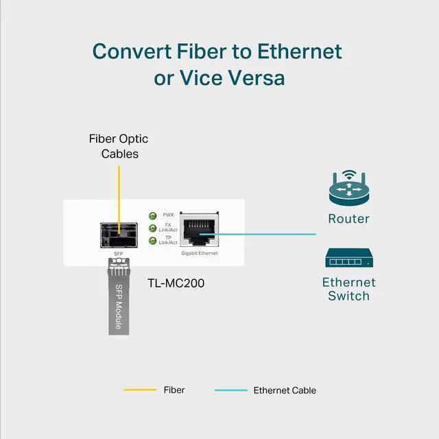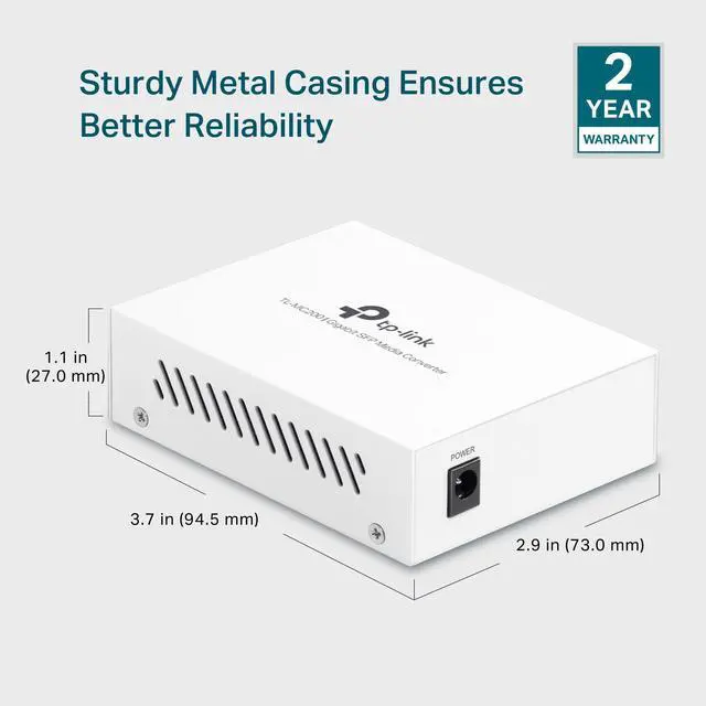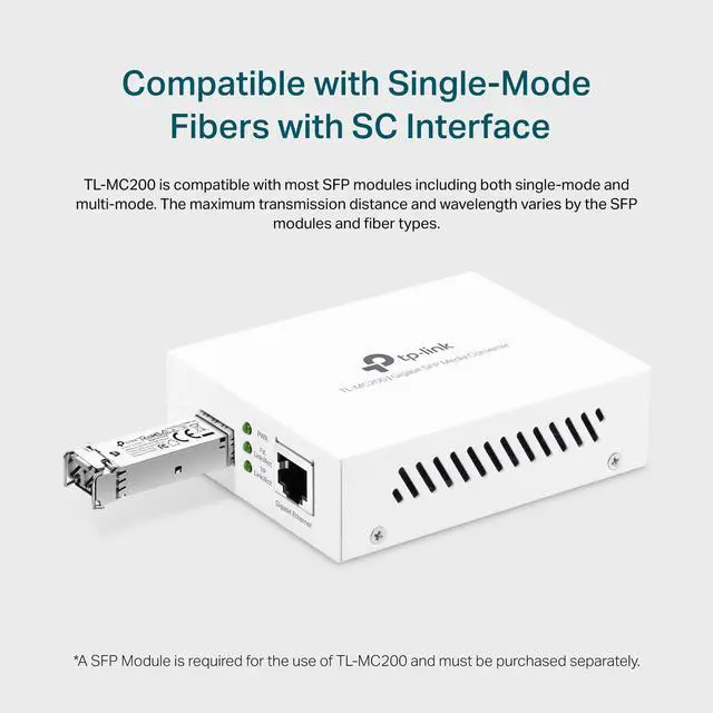 | Specifications | Standards and Protocols: IEEE 802.3, IEEE 802.3i, IEEE 802.3u, IEEE 802.3ab, IEEE 802.3z, IEEE 802.3x Basic Function: - Auto-negotiation of Half-Duplex / Full-Duplex transfer mode - Extends fiber distance up to 20km Interface: - 1 SFP port - 1 10/100/1000 Mbps RJ45 port Wave Length: Depend on used SFP module Dimensions ( W x D x H ): 3.7" x 2.9" x 1.1" (94.5*73.0*27.0 mm) Power Supply: 9V/0.6A Max. Power Consumption: 1.7W LED: PWR, Link/Act Safety & Emission: CE, FCC, RoHS Fiber Type: Depend on used SFP Module Package Content: - TL-MC200 - Power Adapter - Installation Guide Environment: - Operating Temperature: 0°C~50°C (32°F~122°F) - Storage Temperature: -40°C~70°C (-40°F~158°F) - Operating Humidity: 10%~90% non-condensing - Storage Humidity: 5%~90% non-condensing |