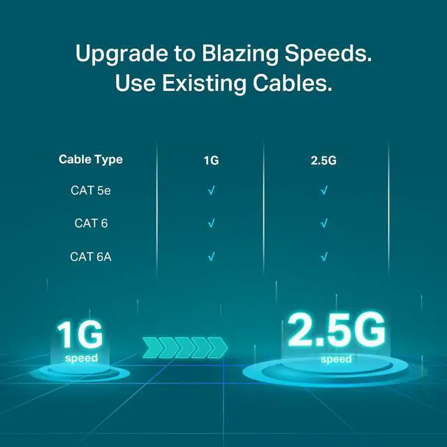 Seamlessly integrates with your existing gigabit ethernet setup, utilizing your current Cat5e cables to deliver 2.5X faster speeds. Say goodbye to expensive Cat6 upgrades and hello to a simpler, more powerful network.